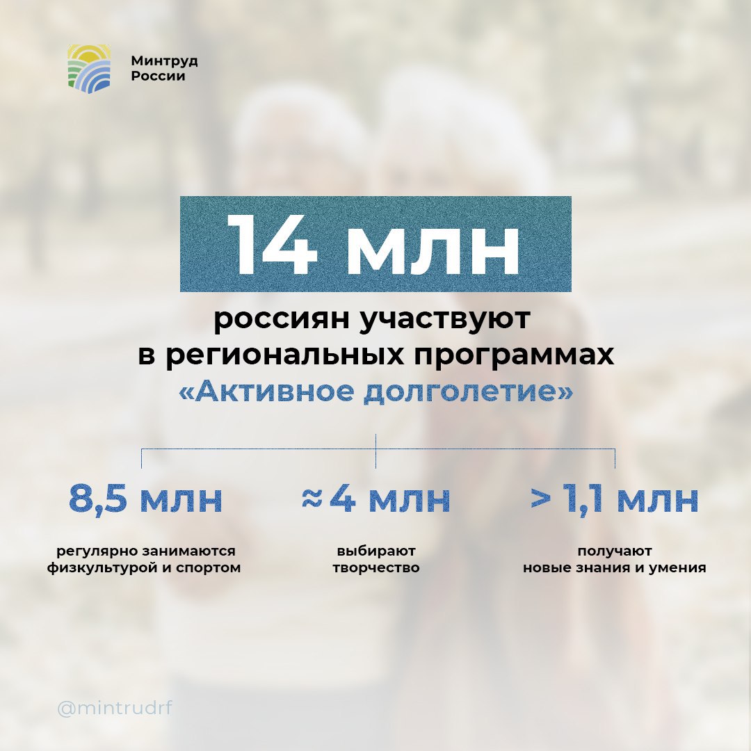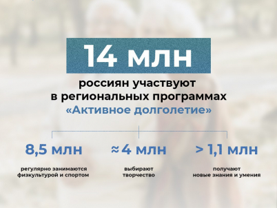 В программах Активного долголетия участвуют порядка 14 млн человек старшего возраста. Они занимаются спортом и творчеством, учатся новому, получают знания, помогают тем, кому необходима поддержка.