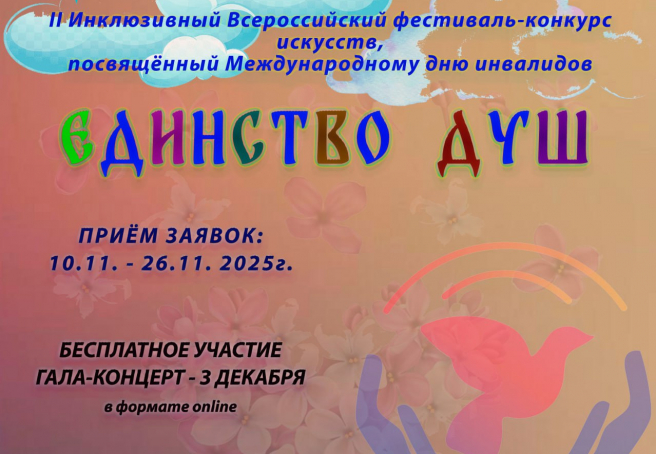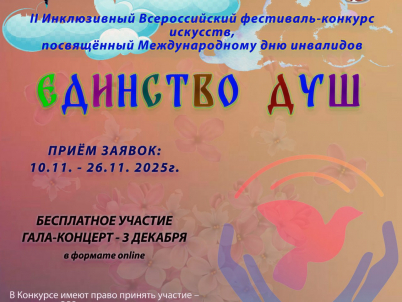 С 10 ноября по 3 декабря 2025 года пройдет дистанционно II Инклюзивный Всероссийский фестиваль-конкурс «Единство душ».